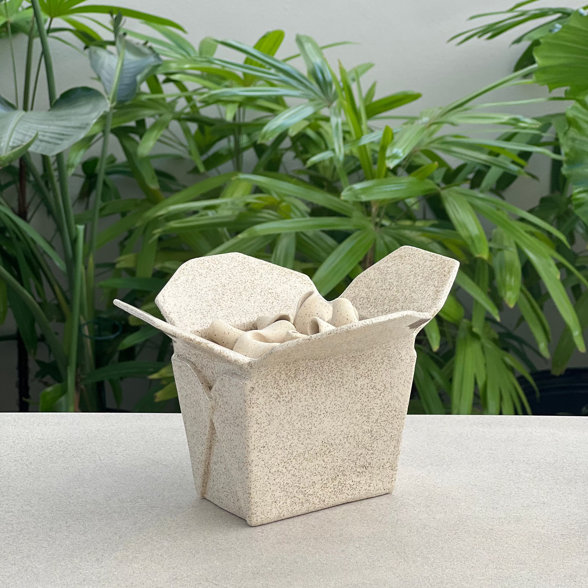 Handmade ceramic takeout box- inspired by the classic Chinese takeout container, but crafted with love. Fill it with our mini fortune cookies that double as chopstick holders.